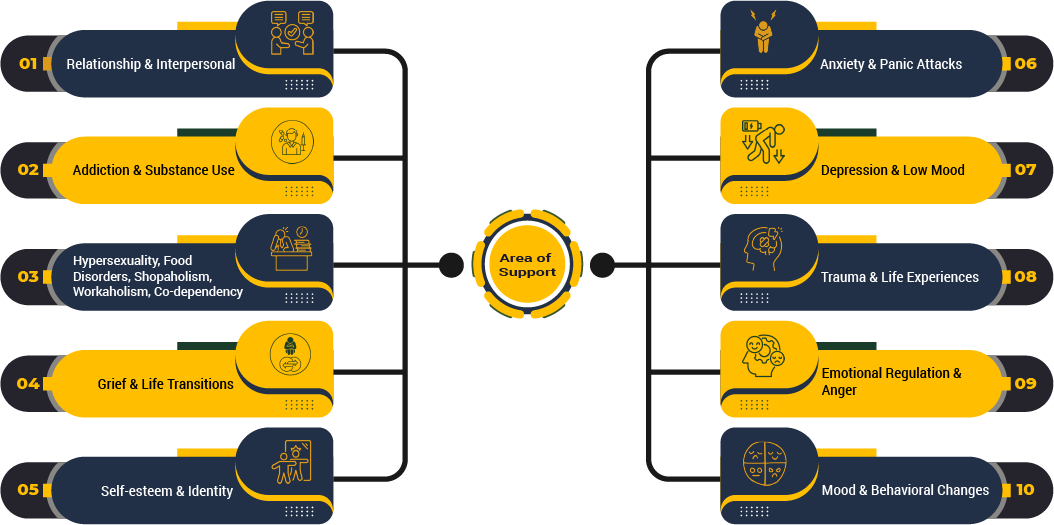 Individuals seek support for many different emotional, psychological, and behavioural concerns, including but not limited to the following: